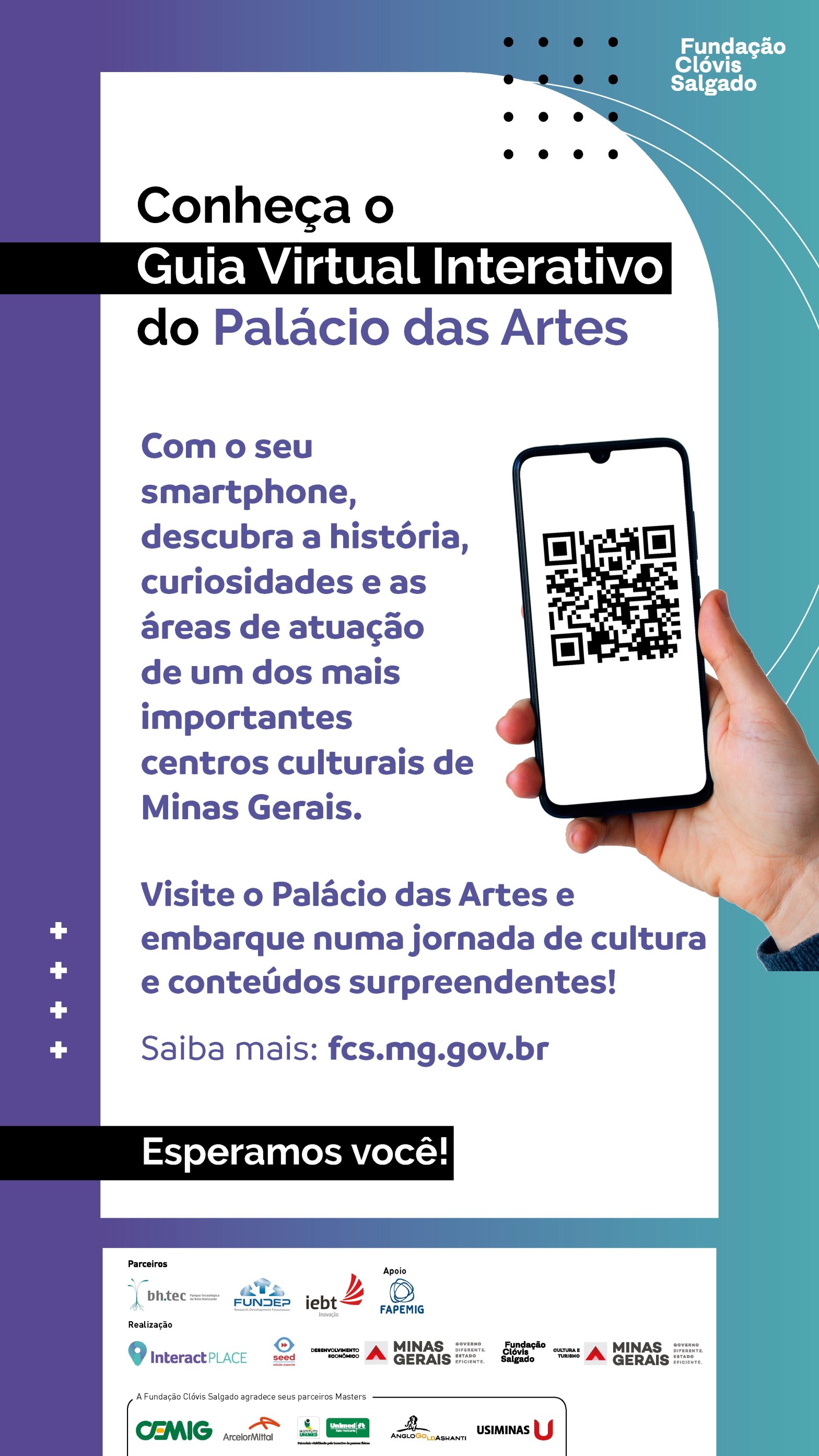 A partir do dia 23 de fevereiro (quarta-feira), o público poderá contar com uma nova ferramenta interativa para ampliar sua experiência no Palácio das Artes de Belo Horizonte: Trata-se de um guia virtual para ser acessado pelo celular, em que o público percorre uma jornada de visitação imersiva e divertida, utilizando QR Codes, aos espaços da Fundação Clóvis Salgado.
