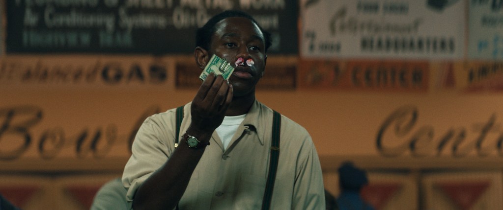 Ainda assim, existe um esforço tremendo por parte do diretor de preservar um realismo imprevisível na reconstrução de época. É impossível conseguir de fato toda a instabilidade que levantar uma câmera em Nova Jersey ou Manhattan hoje vai proporcionar, mas as metrópoles cinquentistas do longa mais caro da história da A24 são tão vivas e cheias de movimento quanto podem. Todos os rostos e espaços constroem um universo, mas também falam por ele. Safdie é um cineasta essencialmente realista, mas que sabe manter personalidade no seu recorte entendendo seus personagens como peculiares e vendo humor no mundo. Marty Supreme é uma comédia. Até existe um elemento anacrônico no filme, especialmente no trio central de jovens – O Marty Mauser de Thimotée; sua situationship, a Rachel de Odessa A’zion; e seu melhor amigo Wally interpretado pelo Tyler, The Creator – que parecem todos muito contemporâneos nas formas que se movem e comunicam. E sinto que o Safdie é consciente disso, é um filme que fala uma linguagem muito contemporânea e consegue incorporar isso na personalidade do seu universo. A trilha-sonora, tanto nas escolhas de needledrops e quanto nas composições originais do Daniel Lopatin, que variam entre Eletrônica Progressiva nos seus momentos propulsivos e um New Age transcendental, dão uma paisagem sonora oitentista para o longa. Pode ser uma narrativa de época, mas o interesse do Safdie vai só até onde existem qualidades pessoais para ele que apelam de forma universal.
